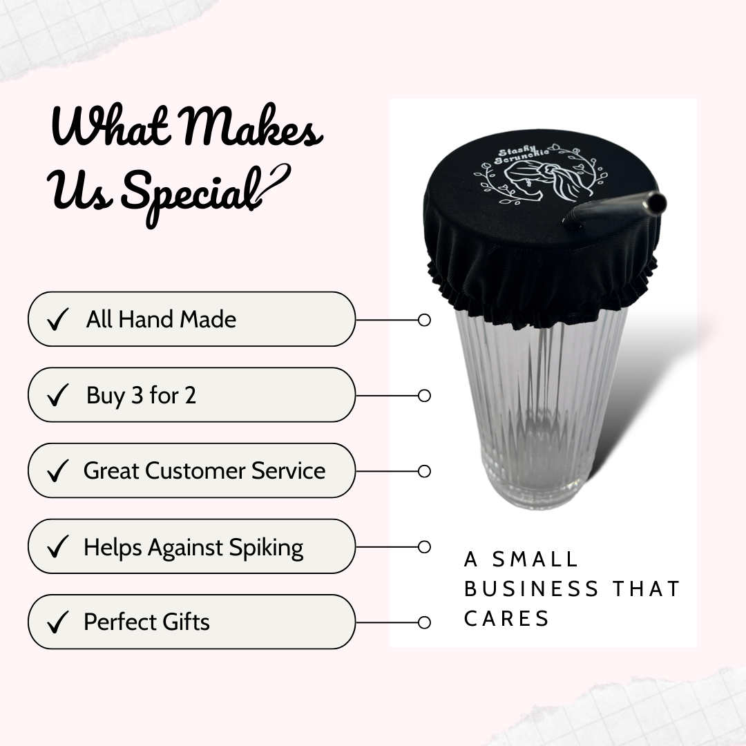 This contains one drink cover and one Velvet Black Stashy Scrunchie